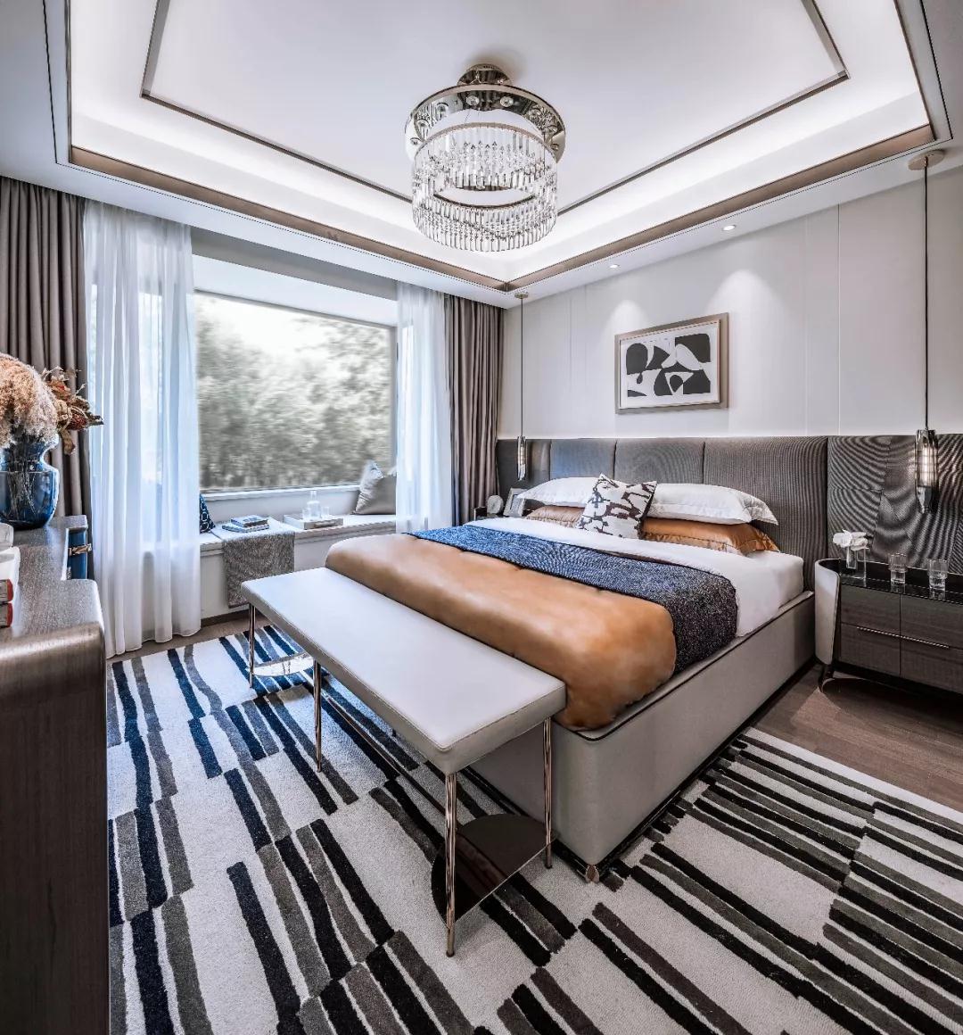 私人空間的設計,講求私密性和舒適感,主臥不僅空間尺度舒怡,吊頂豐富而精致,與墻面簡(jiǎn)歐護墻互相呼應,提升空間整體飽和度,融合高級灰,適合的是永遠追求精致生活的人群。