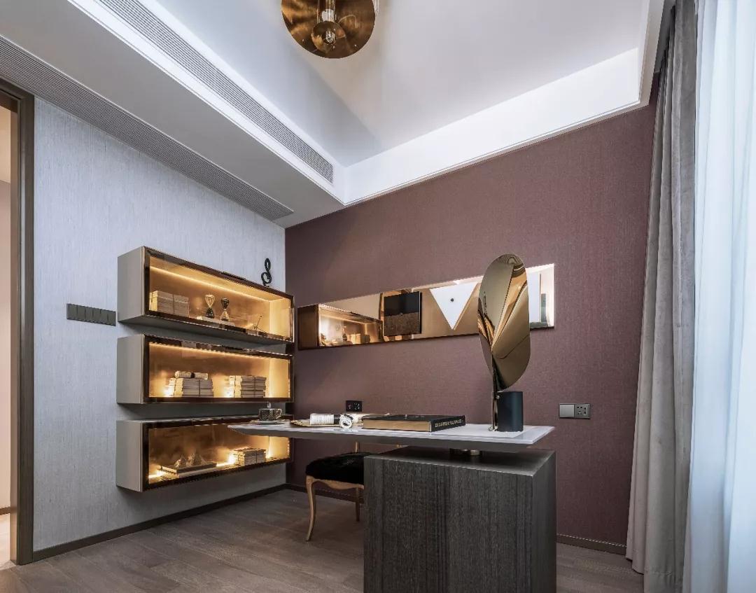書(shū)房是家庭空間中很需要靈感和激情的地方,鍍鉻金屬搭配玻璃素材,皮質(zhì)呈現于低飽和度的亮色背景墻,無(wú)不凸顯都市輕奢設計的精髓,家具線(xiàn)條呈工業(yè)設計的前衛感,柔和的背景墻和自然光照,則展現了當代藝術(shù)的冷冽溫馨感。