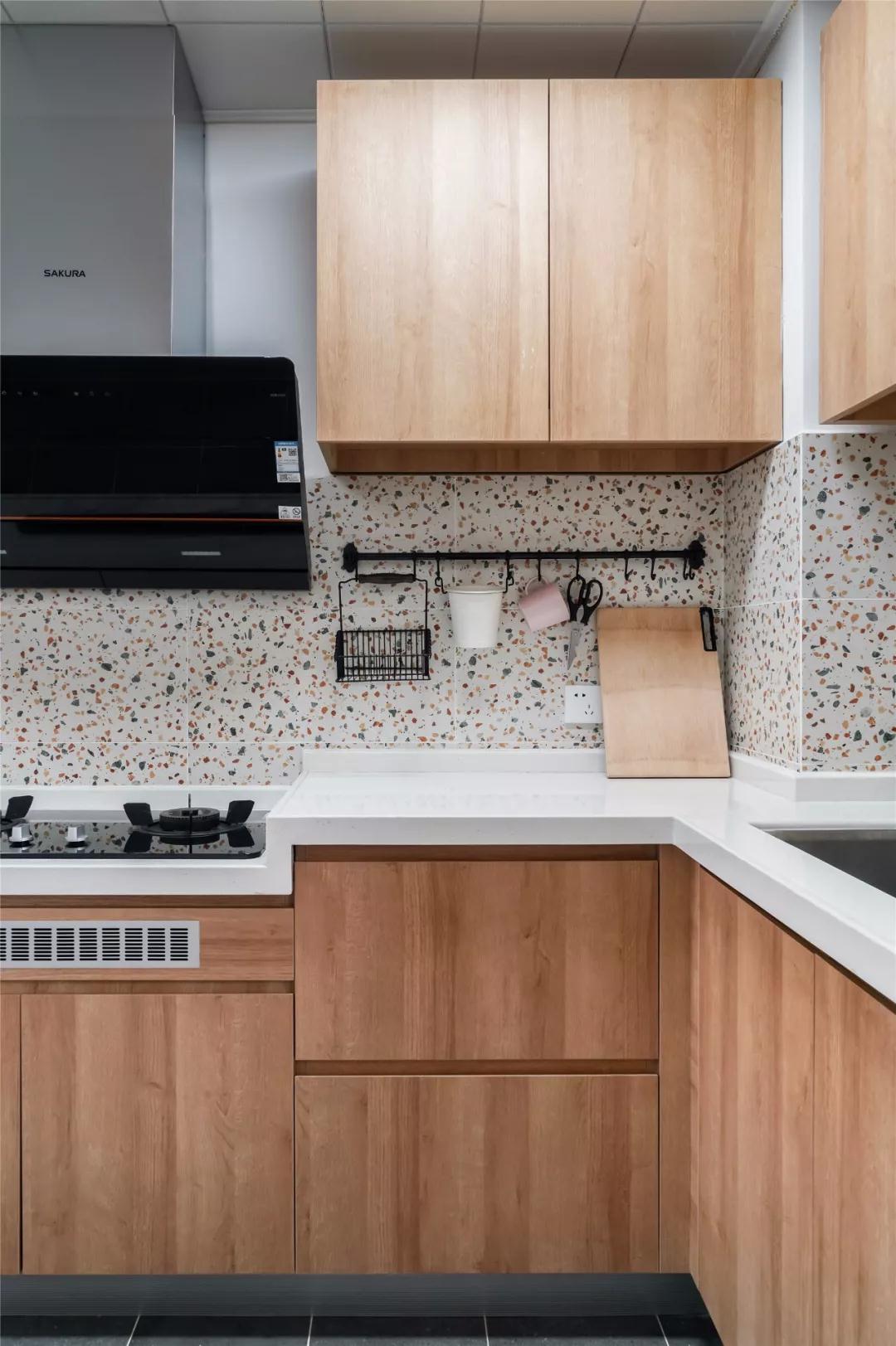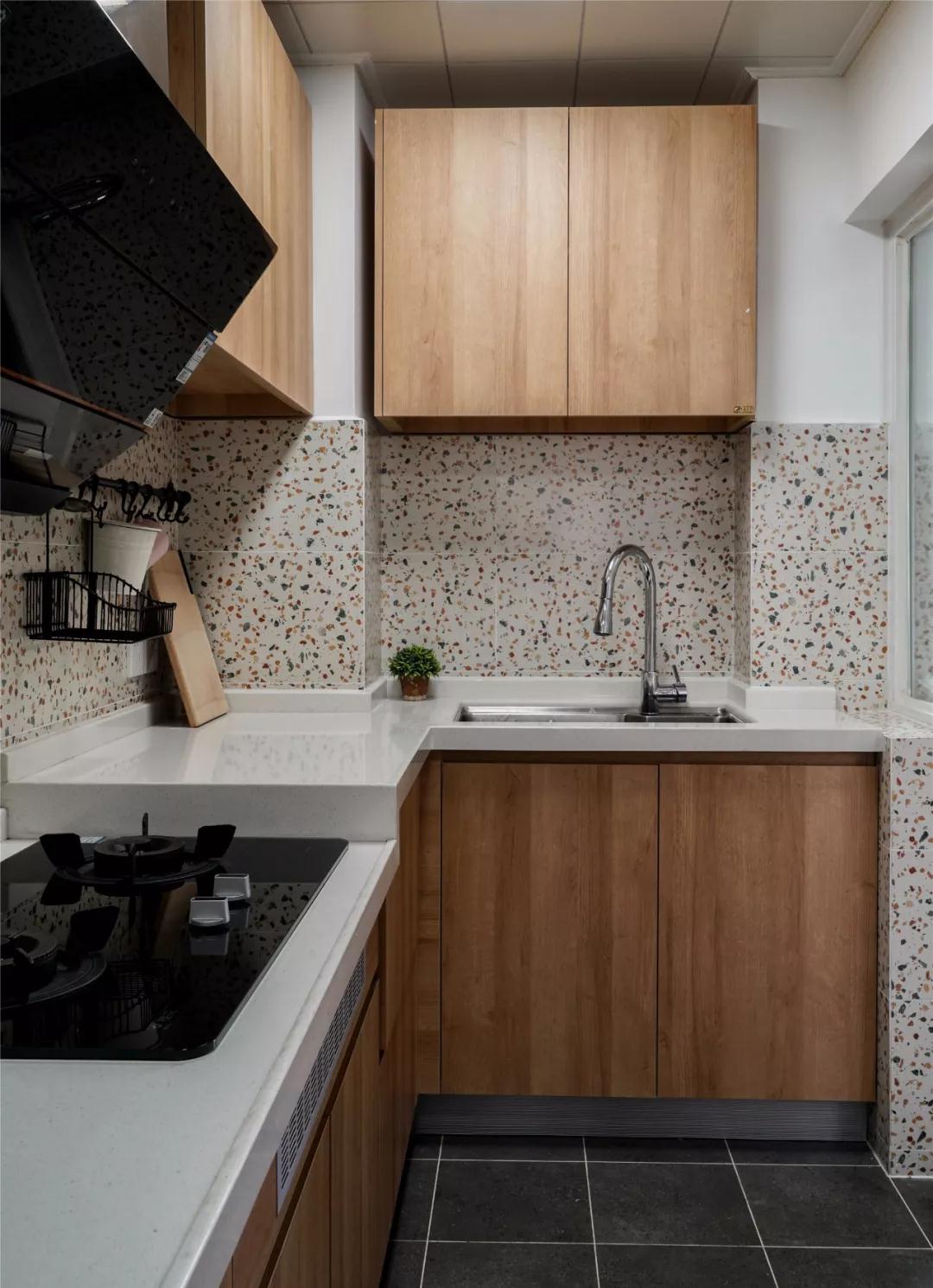 ▲ 廚房地面鋪設灰色水泥磚,半墻鋪貼文藝水磨石磚,搭配溫潤的木質(zhì)櫥柜,整體閑適輕松又自然。