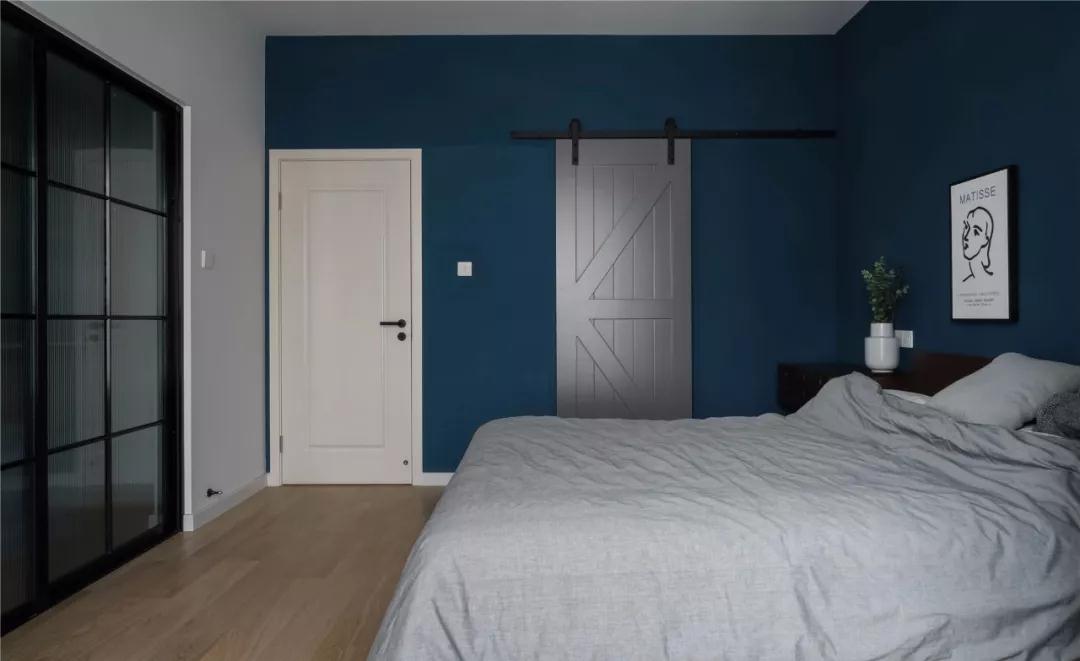 ▲ 深藍色的墻面搭配灰色床品與谷倉門(mén),營(yíng)造沉靜而優(yōu)雅的睡眠氛圍。