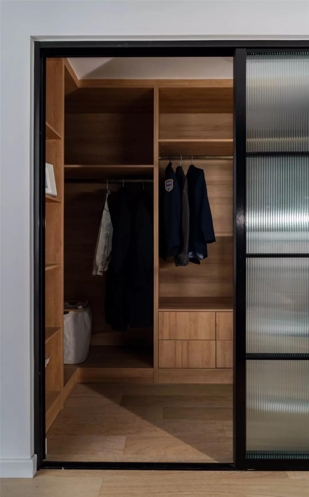 ▲ 衣帽間作為一個(gè)獨立的封閉空間,長(cháng)虹玻璃推拉門(mén)起到了隔絕灰塵的作用。