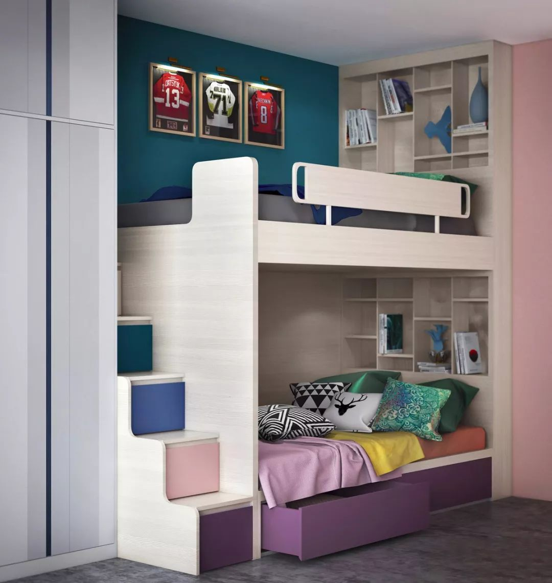 若是房間能放床的空間有限,可以靠墻放一組上下鋪。如果房間里儲物空間較少,可以選擇上床鋪的臺階為抽屜的樣式。也可以在下床鋪與臺階之間,放一組配套的柜子,即能讓床鋪牢固一點(diǎn),又能增加儲物的空間。