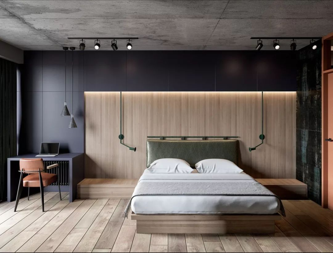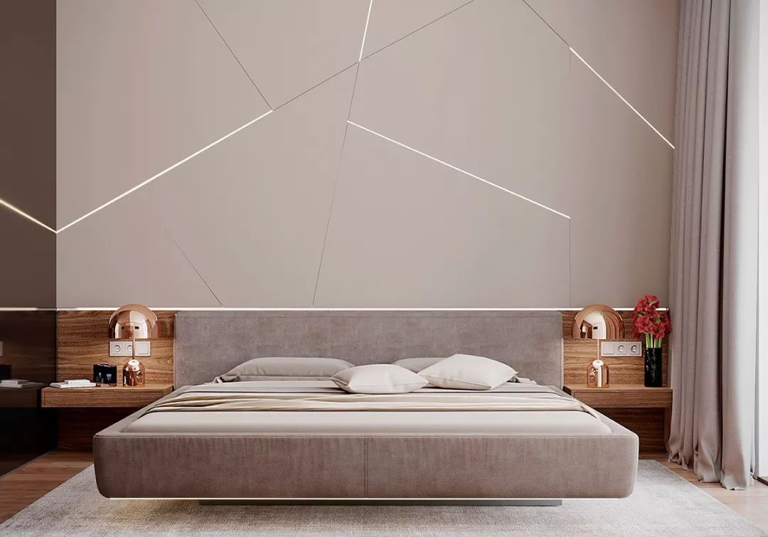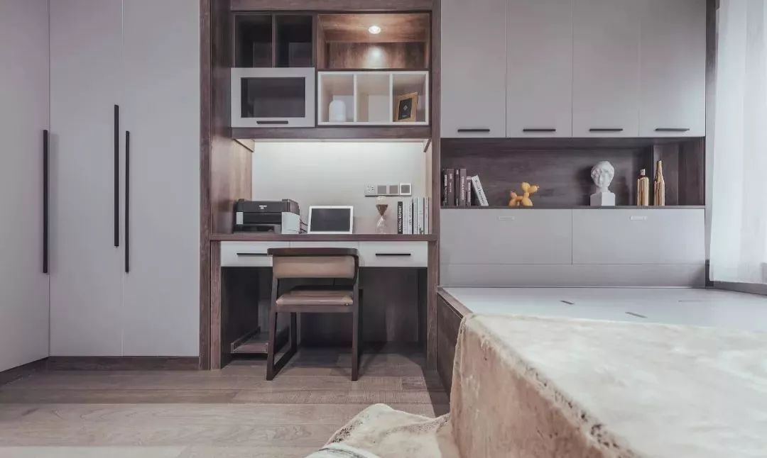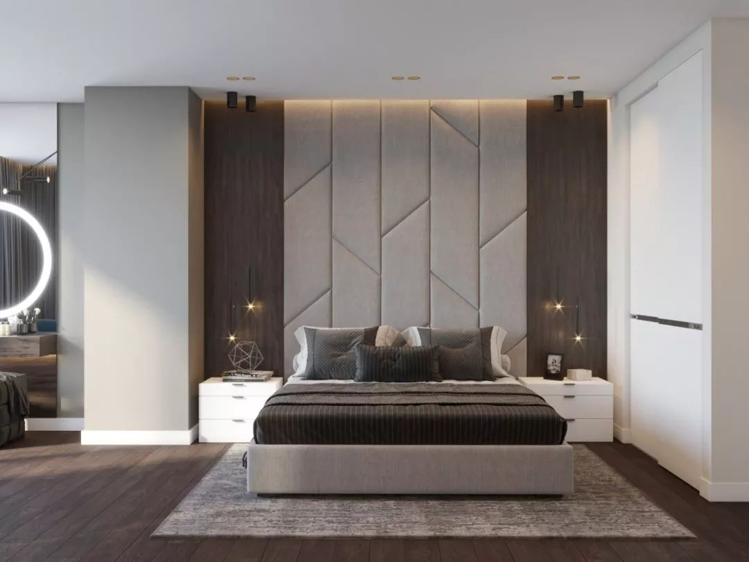 如果用一整面的柜子作為床頭背景墻,那么可以將其中一個(gè)順手放物又不干擾睡眠的地方挖空,作為展示儲物的空間,增加空間的實(shí)用性與藝術(shù)感。