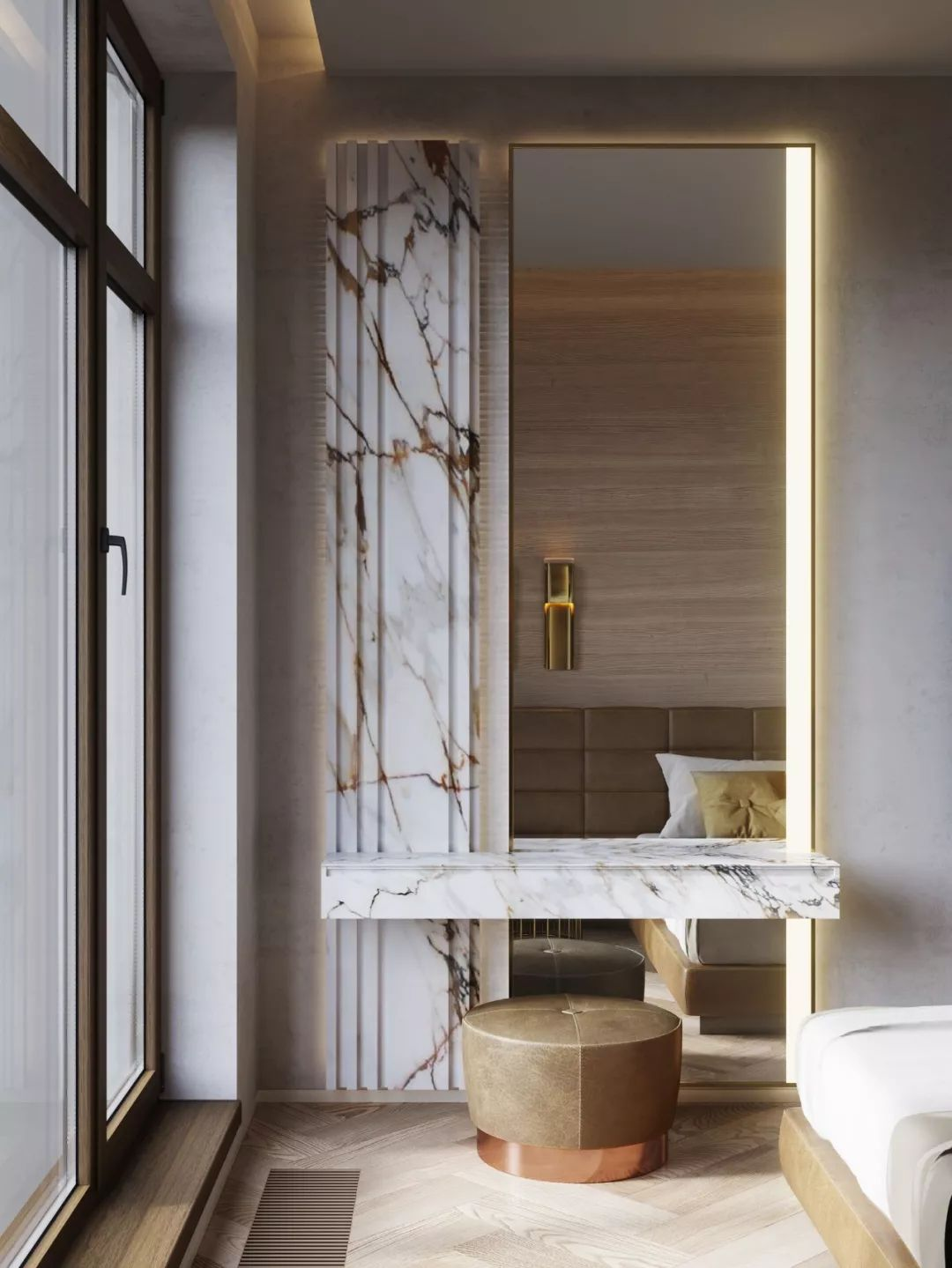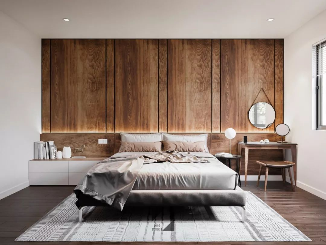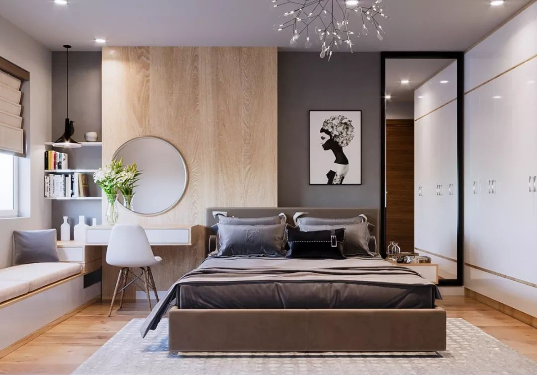 還有一種很好的方式,是將床頭儲物與梳妝臺合二為一。既可以避免鏡子對床的風(fēng)水問(wèn)題(睡得迷迷糊糊,看到鏡子里自己的影子,也是挺嚇人的),其次也可以讓空間整體性和收納性更強,尤其抽屜式的非常方便,收納做好了,精致優(yōu)雅的生活就此開(kāi)始!
