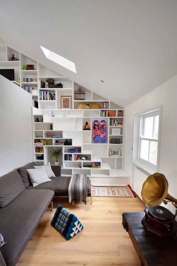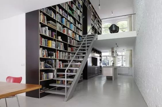 如果家里有樓梯,把書(shū)架做在樓梯的內側也是一個(gè)很不錯的想法。這樣就更有一種藏書(shū)閣的感覺(jué)了。形式可以做不同大小方盒固定式,也可以做成落體式的,都很漂亮。